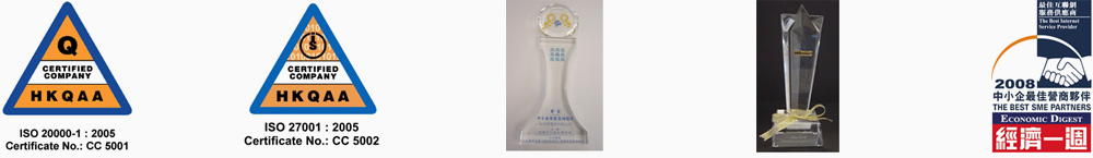 ISO 20000:2005(资讯管理服务)及 ISO27001:2005(资讯安全管理系统)认证(香港唯一间同时获得2项认证的数据中心)